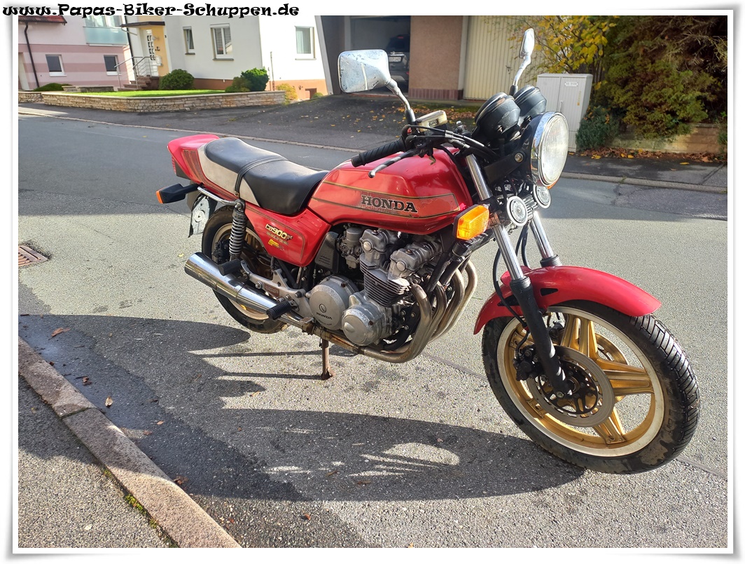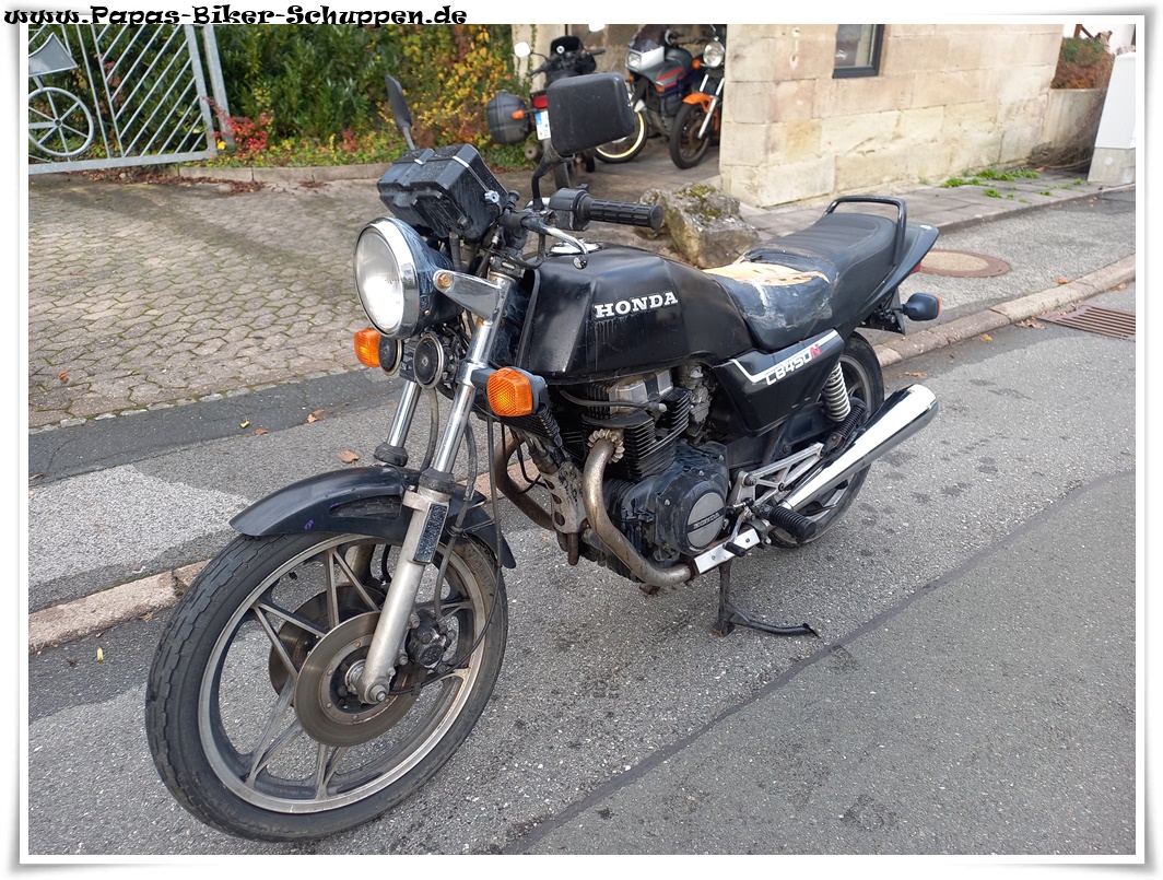 EZ. 1985, 32 KW / 44 PS, 50450 km, diese CB450N wurde 08/2024 abgemeldet und steht seitdem. Für frischen TÜV müsste nach meinen Einschätzungen folgendes gemacht werden: Bremsbeläge vorne, Vorderreifen, Gabelsimmerringe, Batterie und evtl. ein neuer Kettensatz. Der Motor springt super an und läuft tadellos. Das Motorrad ist, bis auf die angegebenen Mängel, so wie sie ist absolut fahrbereit und die komplette Elektrik funktioniert auch tadellos. Schönheitsmängel wie die Lackierung und der Sitzbankbezug sind ja auf den Bildern gut zu sehen.