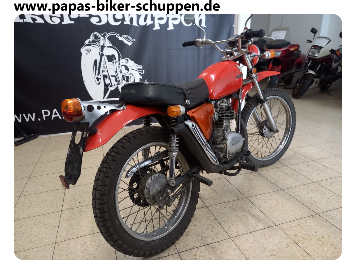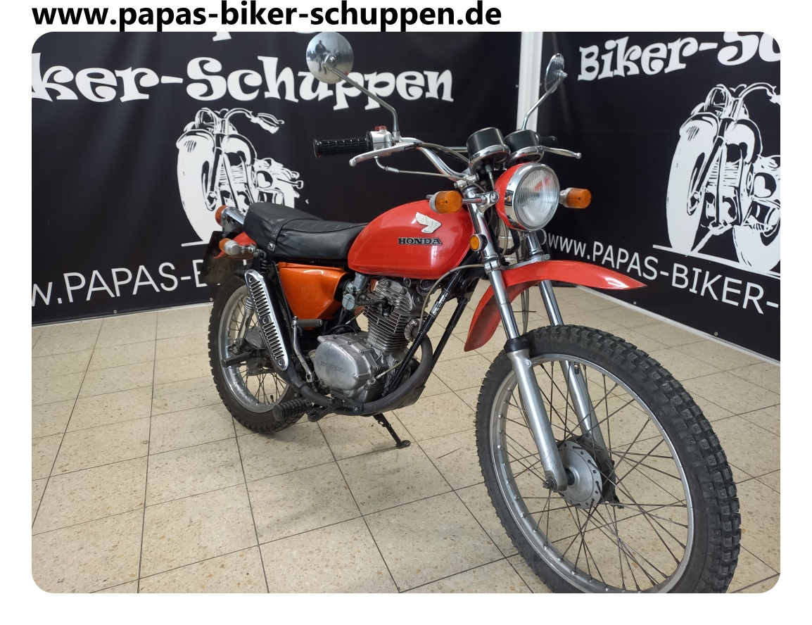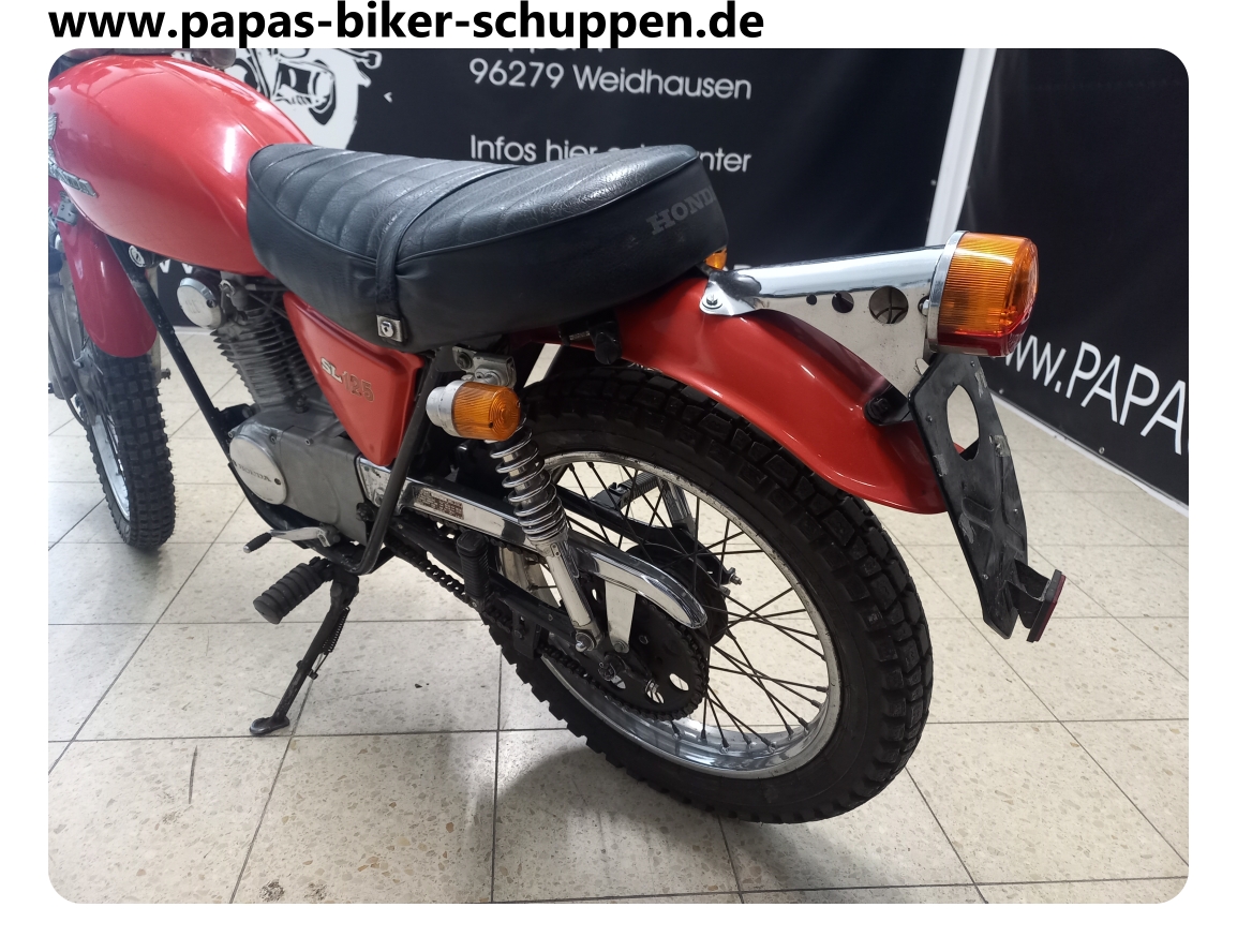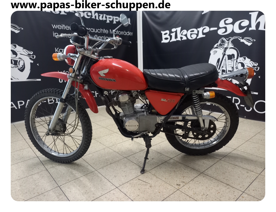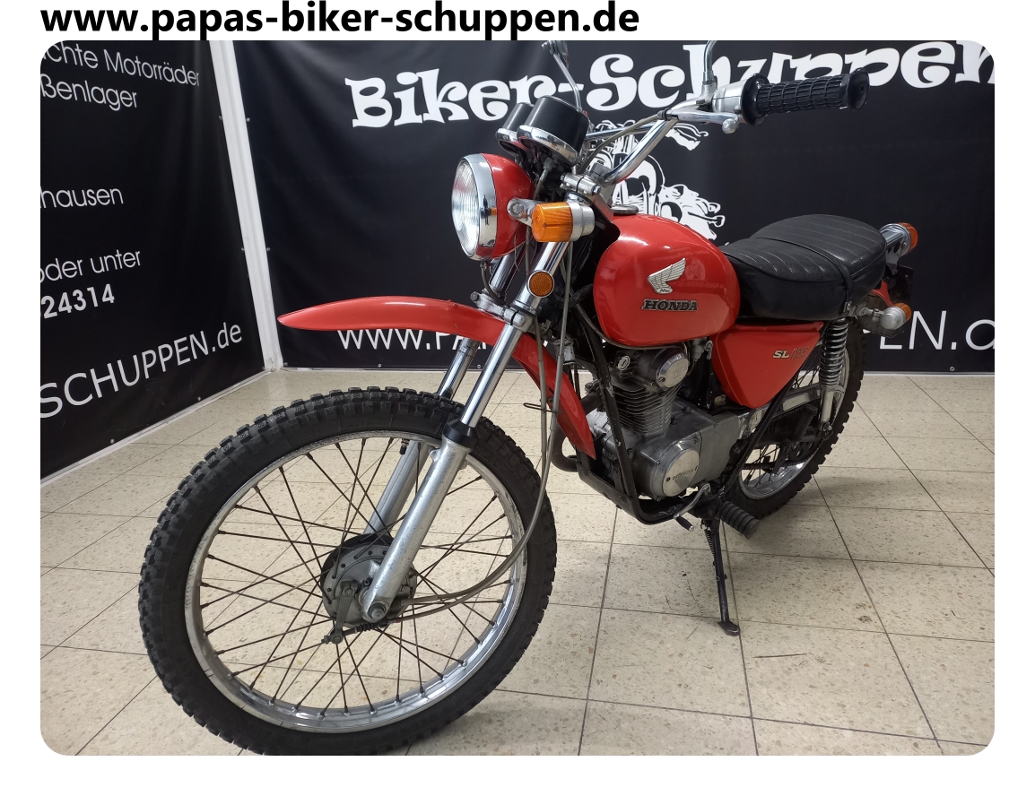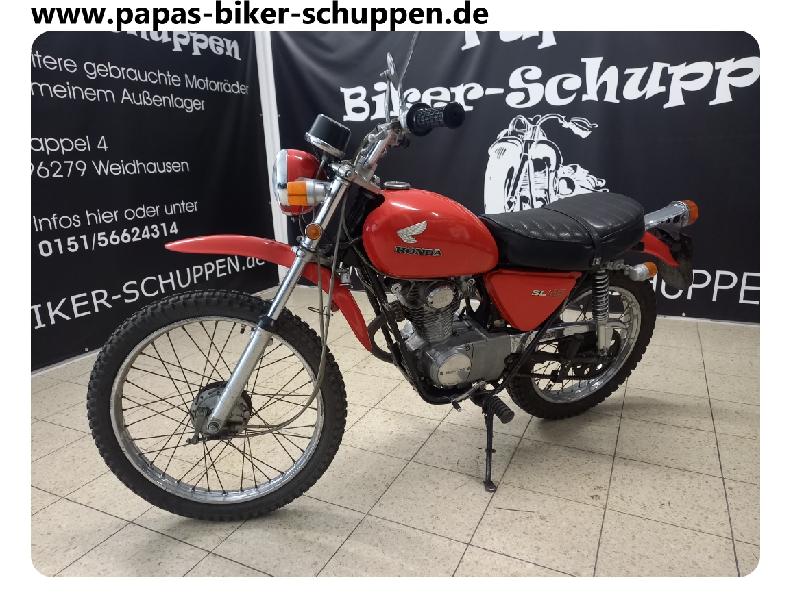 EZ. 1972, 9 KW / 12 PS, 17037 km, Hier handelt es sich um die erste kleine 4- Takt Enduro von Honda. Die SL125 war der Vorgänger der XL125 und ist ein inzwischen extrem seltener Klassiker. Ich selber habe bis jetzt noch nie eine gesehen. Das Teil wiegt fahrbereit 108 kg und ist somit natürlich auch hervorragend fürs Wohnmobil geeignet.